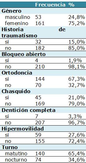 Se incluyeron un total de 214 participantes cuya edad promedio fue 23.8 (DE=2.7), de los cuales 161 fueron de sexo de femenino y 53 masculino. La prevalencia total de HAG fue del 27,6%, de chasquido 21,0% y de historia de traumatismo 15,0%. La distribución de frecuencia de las demás variables se presentan en el tabla 2.