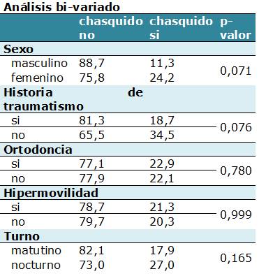 La edad, estar o haber estado en tratamiento ortodóncico, y el turno no fueron asociados con la prevalencia de chasquido para nuestro grupo de participantes. La HAG no se asoció significativamente al signo clínico chasquido (p-valor: 0,408 IC95% (0,318 -1,542)).