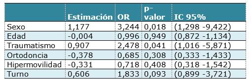 El modelo planteado intentó medir la posible asociación entre los posibles factores de riesgo y el chasquido articular como signo de desorden articular. Los resultados de la RLM se muestran en la tabla 5. El sexo femenino fue asociado como posible factor de riesgo para DA con un OR de 3,2 (p-valor 0,018). El antecedente de traumatismo maxilofacial fue significativamente asociado a chasquido con un OR 2,5 (p-valor 0,041).