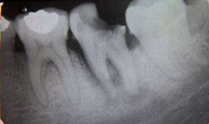 Paciente femenino de 40 años que acude a la clínica de la Especialidad en Endodoncia referida de su centro de salud para valoración y plan de tratamiento del diente 37 por presencia de lesión cariosa de gran profundidad. Se realiza historia clínica y examinación. Las pruebas de sensibilidad pulpar, realizadas con tetrafluoretano (Endo-Ice, Coltene Whaledent, USA 2010), así como las pruebas de sensibilidad periapical resultan negativas, al sondeo periodontal se encontró profundidad de surco gingival de 5mm en zona mesial, ausencia de movilidad del órgano dentario y tejido blando circundante sin signos de inflamación. El estudio radiográfico (Fig. 1) reveló destrucción coronaria en cara oclusal y distal, cámara pulpar comunicada con cavidad oral, lesión radiolúcida asociada al vértice de la raíz distal y lesión radiolúcida periférica en la raíz mesial incluyendo área de furca. Los datos fueron recolectados y analizados, obteniendo como diagnóstico: necrosis pulpar con periodontitis apical asintomática.