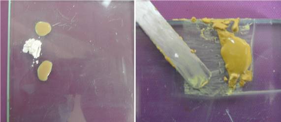 Se inició anestesiando el nervio dentario inferior con lidocaína con vasoconstrictor al 1:100 000. Una vez realizado el aislado absoluto del diente se procedió a realizar la cavidad de acceso utilizando una fresa redonda del #4, con el empleo de puntas de ultrasonido (Varios 3500 NSK, 2010 Japón) se retiraron los cálculos que se encontraban alojados en la cámara pulpar. Posteriormente se realizó el acceso radicular con fresas Gates-Glidden, se estableció la longitud de trabajo de los tres conductos localizados con localizador de forámenes (MiniApex Sybron Endo, USA 2013) y posterior confirmación radiográfica. Se instrumentaron los conductos con Limas rotarias Mtwo (VDW, USA 2012), los conductos mesiales a una lima #40.06 y el conducto distal a una lima #50.04. El protocolo de irrigación fue diseñado en específico para este trabajo, dado que no existía un referente al respecto en la literatura, se creó con la ayuda de 2 profesores del Posgrado de Endodoncia de la Facultad. Se usaron 10ml de solución fisiológica durante la instrumentación, con la finalidad de eliminar los residuos generados y también a manera de lubricante para los instrumentos, la irrigación final se realizó con 3 ml de EDTA para eliminar la capa de barrillo dentinario y propiciar una mayor difusión del medicamento intraconducto. Se descartó el uso de hipoclorito de sodio con la finalidad de que la acción antibacterial recayera en la medicación intraconducto del propóleo con hidróxido de calcio. Se secaron los conductos y se realizó la mezcla de propóleo (Gourmiel propóleos de abeja al 20%, autorizado, producido, y distribuido bajo la norma oficial mexicana NOM-003SAG/GAN-2017) con hidróxido de calcio a razón de 2:1 (Fig. 2), una vez que el preparado se encontraba homogéneo se colocó dentro de los conductos, auxiliándonos para ello con la lima apical final. Posteriormente se colocó teflón y Cavit como restauración temporal.