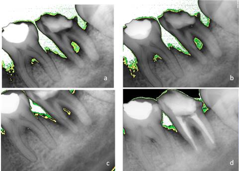 A los 7, 15 y 21 días se realizaron recambios del medicamento intraconducto, así como la toma de radiografías control en cada cita. Adicionalmente se realizó un análisis a través de un software de computadora (Kodac software), con el cual se evaluó de manera digital las áreas de densidad ósea perriradicular presente en cada cita, refiriéndose la zona blanca a ausencia, zona verde un 2.5% y zona amarilla un 7%.