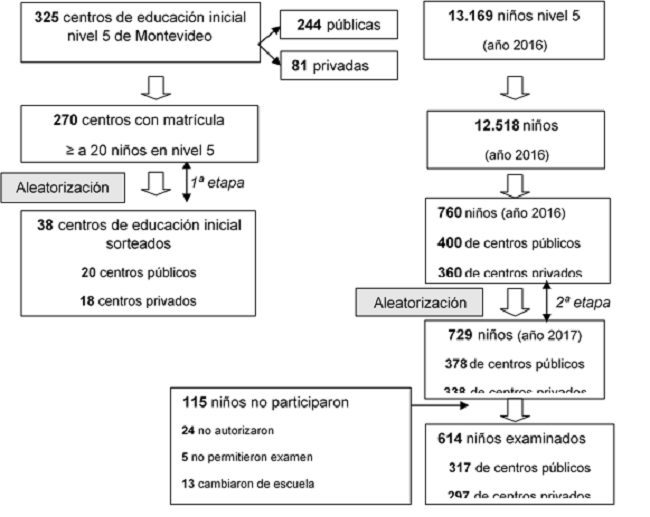 Se diseñó un muestreo probabilístico estratificado por conglomerado bietápico. El marco muestral para el sorteo de la primera etapa estuvo compuesto por 270 centros (12.518 preescolares de nivel 5), de acuerdo al registro de la Administración Nacional de Educación Pública (ANEP) del año 2016. Estos centros se seleccionaron por tener una matrícula mayor o igual a 20 niños por clase en nivel 5. Los conglomerados sorteados para la primera etapa fueron 38 centros de educación inicial: 20 públicos y 18 privados, con un total de 760 preescolares (400 de centros públicos y 360 de centros privados). Esta reducción entre la cantidad de preescolares en el cálculo original y los conglomerados sorteados (centros educativos a visitar) se realizó con el fin de garantizar la eficiencia de los recursos logísticos y humanos existentes, lo que afectó ligeramente la precisión a 5,9%.