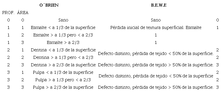 Fue modificado el código 3 de profundidad original; la exposición pulpar fue considerada por proximidad, fina capa de dentina remanente que en algunas ocasiones permite traslucir la pulpa y en otras se produce un ligero oscurecimiento. 2