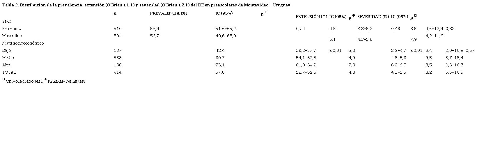 En Uruguay, no existen datos epidemiológicos en esta edad. El objetivo de este estudio fue determinar y describir la prevalencia, extensión, distribución y severidad del DE en niños preescolares de 5 años de Montevideo, Uruguay. Así también su relación con sexo y nivel socioeconómico.