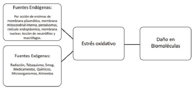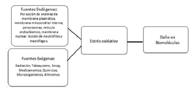 Los oxidantes y los radicales libres se forman continuamente de forma fisiológica en las células y pueden participar en la señalización redox. En los sistemas biológicos se puede establecer una condición de estrés oxidativo a partir de oxidantes y radicales provenientes tanto de fuentes endógenas, como exógenas (Figura 2). Cuando nos encontramos en condiciones patológicas, la formación de estas especies puede aumentar significativamente y mediar el daño oxidativo de diferentes biomoléculas (lípidos, glúcidos, ADN y proteínas). Las especies reactivas generadas pueden provocar daño en ADN, modificación y/o inactivación de proteínas y carbohidratos y también oxidación de lípidos. Para prevenir este daño causado por los radicales libres, los organismos, principalmente aerobios, desarrollaron a lo largo de la evolución, sistemas de defensa o sistemas antioxidantes 1)(25.