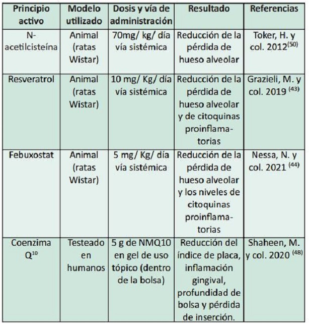 En base a las evidencias del rol principal del estrés oxidativo en la periodontitis, se ha comenzado a intervenir específicamente con farmacología redox, es decir, compuestos que puedan ser administrados a pacientes para atenuar los efectos deletéreos del estrés oxidativo a nivel local 48. En la tabla 1, se muestran los más relevantes de la literatura en el área. Actualmente se están ensayando fármacos como el resveratrol, un estilbenoide natural presente en diferentes alimentos, que a través de formulaciones nutracéuticas administradas por vía sistémica, ha demostrado ser eficaz en disminuir la velocidad de pérdida ósea en modelos animales de periodontitis expuestos al humo de tabaco 43. Por otro lado, existe evidencia de que el febuxostat, un inhibidor de la xantina oxidasa, también podría ser otro potencial agente para el tratamiento de la periodontitis. Como fue mencionado previamente el ácido úrico, producto enzimático de la xantina oxidasa, es uno de los principales antioxidantes de bajo peso molecular de la saliva. Paradójicamente, a pesar de la inhibición de esta enzima y en consecuencia de la disminución en la producción de ácido úrico, el febuxostat ha demostrado ser capaz de enlentecer la pérdida ósea y disminuir los niveles de citoquinas proinflamatorias y de biomarcadores de daño oxidativo (i.e. HNE) 44. Por el contrario, la mayoría de los antioxidantes convencionales presentan inconvenientes como la baja solubilidad en agua, estabilidad y corta duración de acción cuando son de aplicación tópica 48. Por otra parte, la farmacología redox también está siendo probada en la elaboración de nanomateriales (nanopartículas cargadas con fármacos) y presenta la ventaja de que el componente es liberado específicamente en el sitio terapéutico (aplicación tópica), con alta biocompatibilidad y baja toxicidad 49. Si bien el uso de nanopartículas cargadas con antioxidantes se encuentra en etapas iniciales de desarrollo, los pocos ejemplos reportados, entre ellos cargados con coenzima Q10, mostraron un gran potencial para el tratamiento de la periodontitis 48.