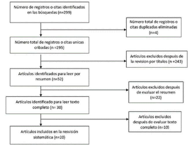 Los investigadores seleccionaron los artículos de forma independiente en 3 fases correspondiente a la lectura del título, resumen y texto completo, donde se compararon los resultados y en aquellos estudios donde hubo desacuerdo, se revisaron en conjunto los criterios de inclusión y exclusión. Los resultados de la selección final son representados en diagrama de flujo PRISMA.