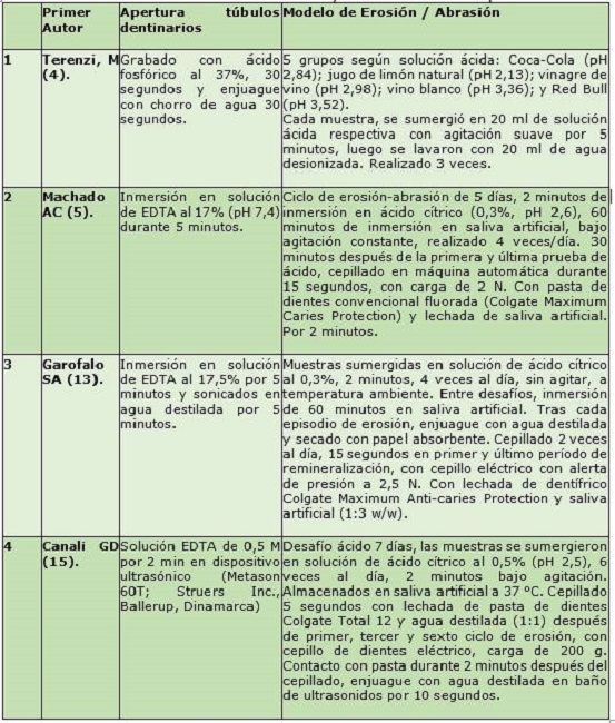 En la tabla 1 se describen la metodología con la cual los estudios in vitro simularon SD, abriendo los túbulos dentinarios con gel de ácido fosfórico y/o solución EDTA respectivamente, obteniendo máxima permeabilidad 4,5,14,16 y los modelos de erosión / abrasión practicados.