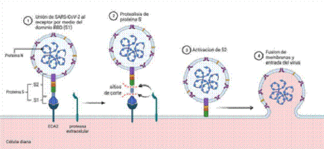 SARS-CoV-2 usa el mismo mecanismo de infección que otros coronavirus, basado en el reconocimiento de un receptor celular ECA2 por parte de la proteína S (Figura 1, etapa 1). La proteína S es una glicoproteína formada por dos dominios, el dominio S1 -que contiene la región conocida como RBD, que se une a ECA2- y el dominio S2, que posee la maquinaria de fusión de membranas que le permite al virus entrar a la célula. La unión a ECA2 induce un cambio conformacional en S1 determinando que se exponga sitios de corte para proteasas presentes en la membrana de varios tipos celulares, en particular la proteasa de serina transmembrana 2 (TMPRSS2) o la furina 17. La actividad de la proteasa corta entre S1 y S2 (Figura 1, etapa 2), lo que desencadena que la maquinaria de fusión de membranas presente en éste dominio quede en condiciones de actuar (Figura 1, etapa 3) y determine la fusión entre la membrana celular y viral y la interiorización del virus por endocitosis (Figura 1, etapa 4).