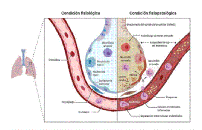 Dado que el SARS-CoV-2 se transmite por el aire en forma de aerosoles o gotas microscópicas 29) es de esperar que tenga tropismo por tejidos de la cavidad nasofaríngea y las vías respiratorias. Este tropismo está dado por la expresión de ECA2 en estos tejidos 12. La infección del sistema respiratorio por SARS-CoV-2 ocurre en tres fases. La primera sucede en la cavidad nasofaríngea, infectando algunos tipos celulares (ver sección 4.7) pero no genera una respuesta inmune muy vigorosa, y es generalmente el tipo de infección que cursan los asintomáticos. La segunda fase implica la infección de las vías respiratorias mayores, bronquios y bronquiolos; que se manifiesta con síntomas de inflamación pulmonar y puede cursar con o sin hipoxia. La tercera fase implica la infección de las estructuras de intercambio gaseoso, los alvéolos, los cuales están formados mayoritariamente por dos tipos celulares de origen epitelial llamados neumocitos tipo I y II 30. Los tipo I presentan morfología epitelial clásica, mientras que los tipo II son cuboidales y más pequeños y contienen unos organelos llamados cuerpos lamelares que secretan el surfactante pulmonar, un tensoactivo sin el cual los alvéolos colapsarían después de la exhalación 27) (Figura 2). La homeostasis pulmonar se mantiene mediante una red de células residentes que incluyen células epiteliales, endoteliales y leucocitos 31. Las macrófagos alveolares residentes y las células epiteliales forman una barrera crítica en el pulmón (Figura 2, izquierda). La infección de un neumocito tipo II determina un cambio en el perfil de expresión génica, incluyendo un aumento en la expresión de genes asociados a la respuesta antiviral, como ser interferones y ciertas interleuquinas, y disminución en la expresión de genes encargados de la producción del surfactante 32. Estas señales activan células del sistema inmune residentes en los alvéolos, como ser los macrófagos, y reclutan otras, como ser neutrófilos, que trasvasan desde la circulación 31 (Figura 2, derecha). Una característica de la infección por SARS-CoV-2 es que las células infectadas pueden desarrollar una alta carga viral 30) y desencadenar un programa de muerte celular llamado piroptosis, que involucra la liberación masiva de mediadores inflamatorios 33, lo cual aumenta exponencialmente el daño de los neumocitos tipo I, con la consiguiente rotura de la barrera alveolar y la infiltración de componentes proteicos y celulares del plasma. El alveolo dañado por la respuesta inmune comienza a llenarse de una mezcla de exudado del vaso, células muertas, partículas virales, células inflamatorias, fibrina, entre otros, aumentando el volumen del intersticio entre vaso y alveolo (Figura 2, derecha). Como consecuencia, se compromete la capacidad de intercambio gaseoso, generando en última instancia la disfunción respiratoria asociada que da nombre al cuadro clínico (“SARS”, síndrome respiratorio agudo grave) 30,31,34. Adicionalmente, la respuesta inmune asociada a la infección puede desencadenar una respuesta conocida como “tormenta de citoquinas”, que es una cascada de eventos inflamatorios que genera un cuadro de hiperinflamación sostenida el cual puede causar hipercoagulabilidad en la microvasculatura, conduciendo a lesión tisular, coagulación intravascular diseminada e insuficiencia multiorgánica 35,36.