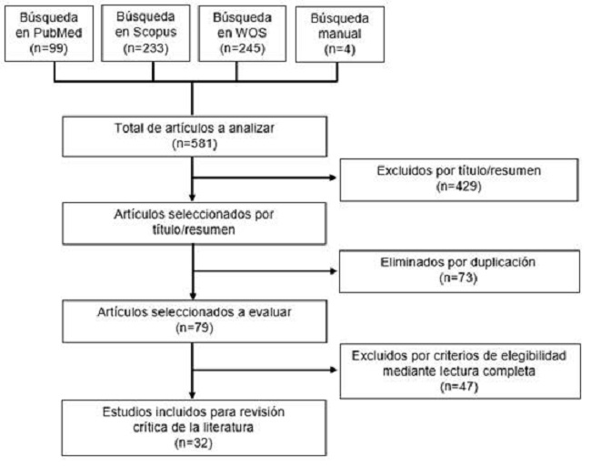 De la búsqueda se obtuvo un total de 581 artículos, de los cuales, según criterios de elegibilidad y análisis por parte de los investigadores se seleccionaron 32 artículos; 31 en inglés y 1 en español (Fig. 2).