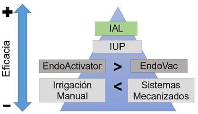 Finalmente, la técnica menos eficaz es la irrigación manual debido a la ausencia de un coadyuvante al suministro continuo del irrigante 31. En cambio, la irrigación asociada a sistemas mecanizados presenta mayor eficacia producto del contacto físico entre el instrumento rotatorio y las paredes del conducto radicular. Por otro lado, el sistema EndoActivator logra un mecanismo hidrodinámico superior a EndoVac, permitiendo la penetración, circulación y flujo del irrigante en las áreas de difícil acceso del SCR 40. La irrigación ultrasónica pasiva presentó uno de los mejores resultados, se recomienda debido a que su activación no presenta corte. Sin embargo, IAL presentó la mayor eficacia, debido a la emisión de fotones que crean ondas de choque fotoacústicas en el irrigante y, por lo tanto, limpian eficazmente los conductos radiculares (fig. 3).