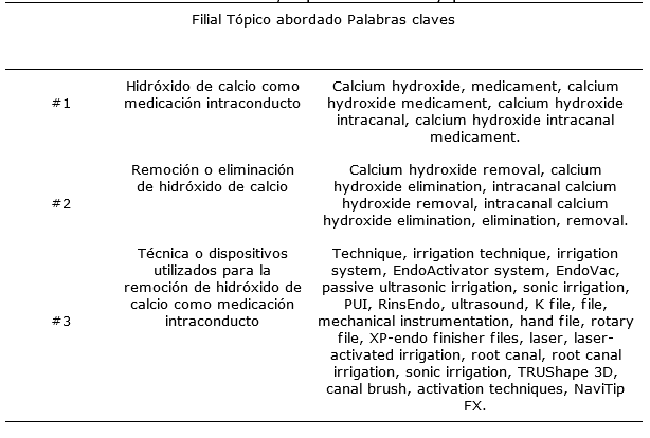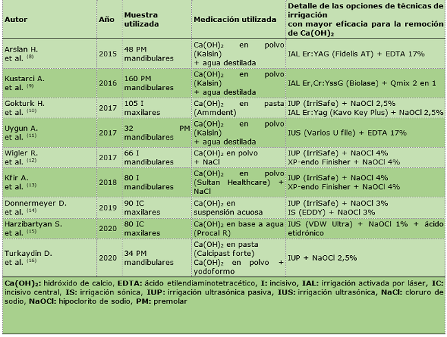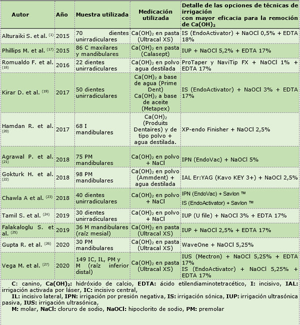 Por lo tanto, este estudio tiene por objetivo caracterizar en base a una revisión bibliográfica las técnicas de irrigación con mayor eficacia en la remoción de Ca(OH)2 como medicación intraconducto, evaluando aspectos como tipo de muestra, tipo de Ca(OH)2, irrigantes utilizados y tipo de dispositivo o instrumental utilizado en las técnicas con mayor eficacia.