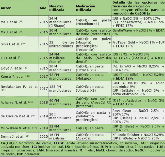A pesar de lo anterior, la evidencia disponible presenta controversia entre los resultados publicados, gran variabilidad en la presentación de estos y diferencias tanto en la estructuración como ejecución de cada una de las técnicas de irrigación. En consecuencia, existe una falta de evidencia que agrupe la gran diversidad de técnicas disponibles según sus tipos y las características de las técnicas con mayor eficacia para la remoción de este medicamento. La técnica con mayor eficacia debe ser comprendida como aquella que elimine la mayor cantidad de Ca(OH)2 a nivel intraconducto.