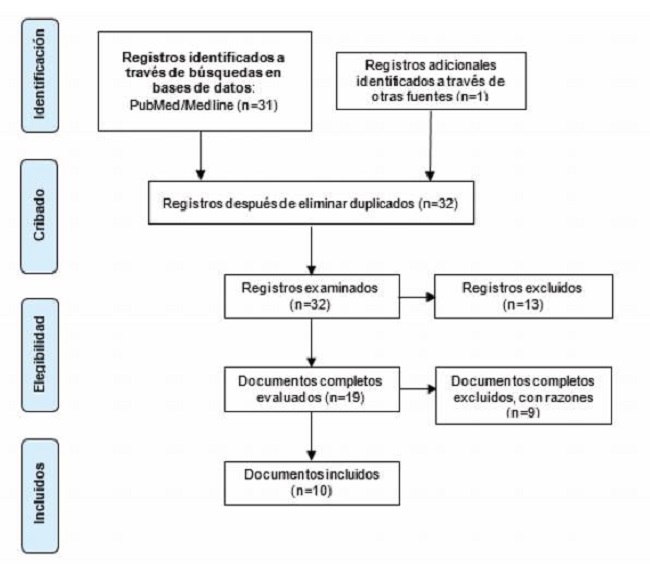 La búsqueda fue realizada entre los días 1 y el 5 de noviembre de 2020, identificando 31 artículos, de los cuales 9 cumplieron con los criterios de inclusión y presentaron la calidad metodológica requerida. Una búsqueda manual posterior permitió incluir 1 publicación más que reunía similares criterios con lo que la totalidad de artículos recabados en esta revisión fue de 10 (Fig. 1).