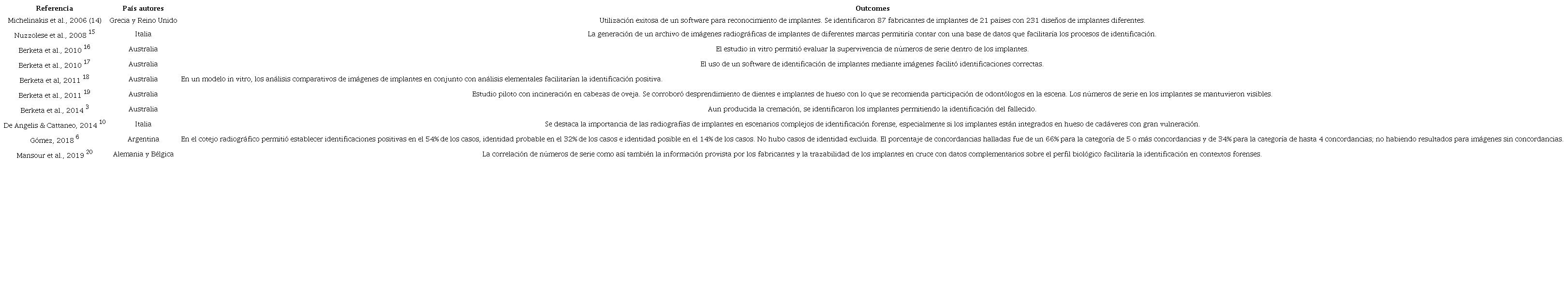 Todos los estudios comprobaron la resistencia de los IDs a la incineración, y si bien las metodologías de identificación han demostrado ser promisorias, en todos los casos ha sido recomendado el abordaje de esta temática en nuevas líneas de investigación, en la estandarización de metodología para asegurar la trazabilidad de los implementos protésicos, y en la necesaria comunicación con las diferentes marcas y compañías comerciales para garantizar lo anterior.