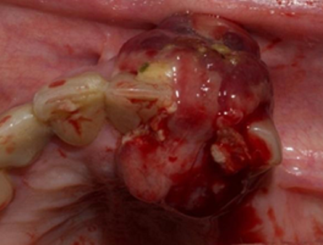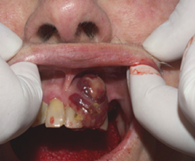 La anamnesis revela que la paciente comenzó hace 12 días con sangrado gingival sin origen aparente y asintomática. Consultó con odontólogo, quien indicó amoxicilina 875 mg, ácido clavulánico 125 mg, cada 8 horas durante 6 días, no observándose respuesta. Posteriormente, refiere aparición del tumor que aumentó de volumen significativamente en los últimos 6 días, indoloro, con intensa hemorragia impide el uso de prótesis parcial removible superior. Al momento de la consulta en el Servicio se constata una lesión tumoral en región del 2.2, sangrante y asintomática. De los antecedentes médicos, se destaca que la paciente es diabética tipo II controlada con dieta e hipoglucemiantes orales, glibenclamida 5 mg y metformina clorhidrato 10 mg, relata acalasia diagnosticada hace 4 años. Presenta una arritmia cardíaca, por lo que es portadora de marcapasos desde hace 4 años. Posee atrofia de la válvula cardíaca izquierda en espera de una cirugía valvular. Tiene historia de nefrectomía total derecha, hace dos años, la cual fue realizada como único tratamiento, sin presentar al momento de la consulta el informe de la histopatología y manifiesta no conocer la naturaleza de la lesión renal que dio origen a dicho tratamiento. No reporta consumo de tabaco, alcohol o drogas.