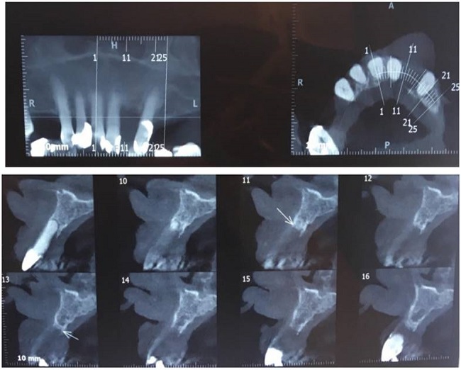 Se plantea como primera hipótesis diagnóstica una lesión inflamatoria reactiva, posible granuloma periférico a células gigantes. Se solicita imagen de tomografía computada para valorar el hueso subyacente, presencia o no de reabsorción ósea o de lesión central. La imagen muestra ausencia de pieza 2.2, enfermedad periodontal crónica, sin alteraciones óseas en el hueso asociado a la lesión a biopsiar (Fig. 3).
