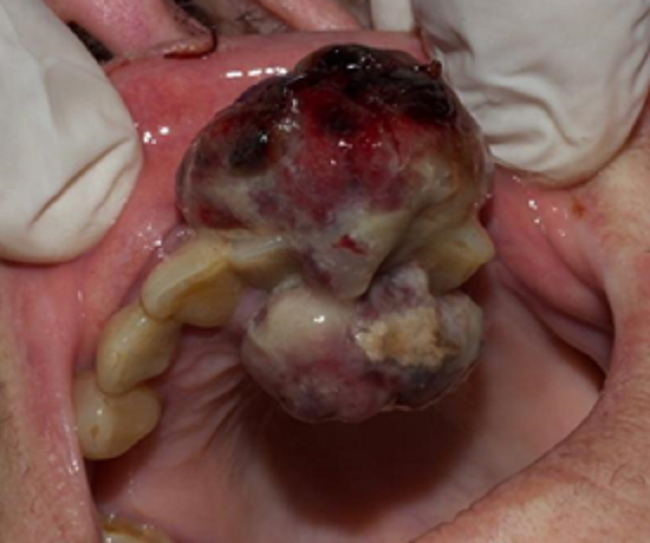 Paciente de sexo femenino, 75 años, jubilada de profesora de piano proveniente del Departamento de Cerro Largo, Uruguay. Es derivada a la Cátedra de Patología, Semiología BMF y Clínica Estomatológica de la Facultad de Odontología de la UdelaR, por una lesión tumoral en sector anterosuperior del maxilar de una semana de evolución.