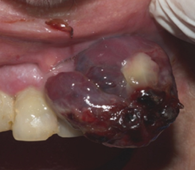 Clínicamente una metástasis oral en los tejidos blandos orales puede verse como una lesión exofítica, a veces ulcerada. Las lesiones tempranas, principalmente las localizadas en la encía, como agrandamientos gingivales, similares a una lesión benigna hiperplásica o reactiva, como granuloma piógeno, granuloma periférico de células gigantes o un fibroma 7. Con la progresión de la enfermedad, puede aparecer sintomatología como: dolor, sangrado, infección, disfagia, interferencia con la masticación y deformación facial 6,7. En algunos casos, especialmente en los carcinomas hepatocelulares metastásicos, se han informado episodios hemorrágicos graves posteriores a la biopsia 15.
