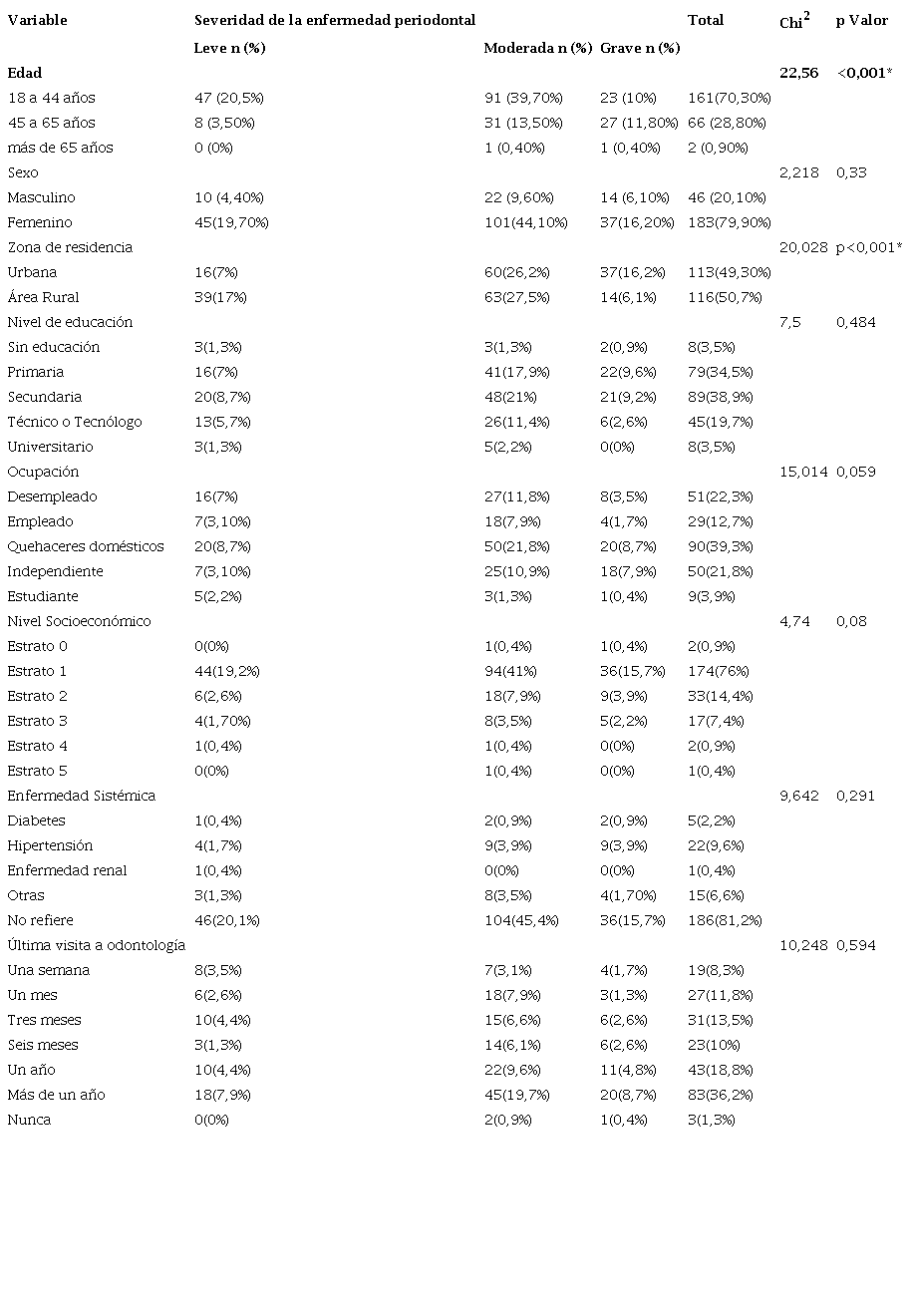 Con respecto a la edad, del total de la muestra (n=229) el 70,30% tenían entre 18 y 44 años, de los cuales el 39,70% presentaban periodontitis moderada. A su vez, la mayoría de la muestra era de sexo femenino equivalente al 79,90% y se obtuvieron valores de 20,10% para el sexo masculino. Respecto al lugar de residencia se encontraron similitudes entre la distribución porcentual del área urbana (49,30%) y área rural (50,7%). Por otra parte, el 76% de los participantes fueron de estrato 1, seguido del estrato socioeconómico 2 con un 14,4%. Entre los grupos de estudio se encontraron diferencias estadísticas significativas en relación a la edad (p<0,001) y zona de residencia (p<0,001) (Tabla 1).