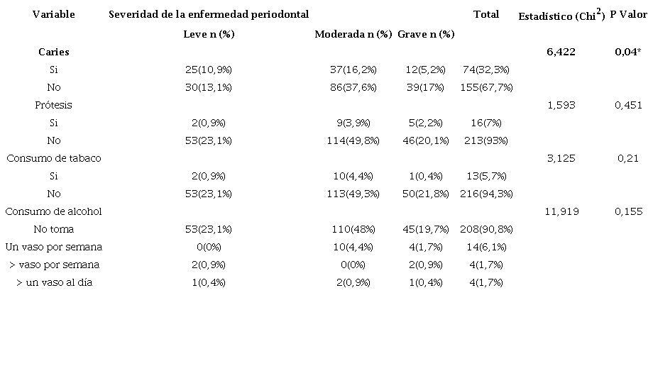 La caries se presentó un 11% más en las personas con periodontitis moderada que en el grupo con periodontitis grave y casi un 6% más que en los que tenían periodontitis leve. Se encontraron diferencias entre los grupos de estudio con relación a la presencia de caries (Tabla 2)
