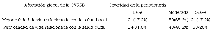 El nivel de afectación global de la CVRSB según la severidad de la periodontitis, expuso porcentajes del 31,8% para peor calidad de vida en los individuos diagnosticados con periodontitis leve. El 40,2% de los participantes con periodontitis moderada evidenciaron una peor calidad de vida. Por otro lado, la distribución de personas con periodontitis grave que tuvieron peor calidad de vida fue del 28% (Tabla 3).