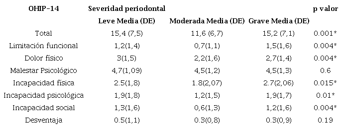 Resultados: Se encontró que los sujetos con periodontitis moderada tenían peor OHRQoL (40,2 %) en comparación con aquellos con periodontitis leve (31,8 %) y grave (28 %). Se encontraron diferencias estadísticamente significativas entre los grupos en cuanto a limitación funcional (p=0,004), dolor físico (p=0,004), incapacidad física (p=0,015), incapacidad psicológica (p=0,01) e incapacidad social (p= 0,004).