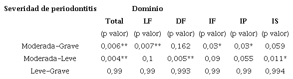 En el análisis post hoc con la prueba de Dunn-Bonferroni se observaron diferencias estadísticamente significativas entre los grupos moderada-leve (p=0,004) y moderada-grave (p=0,006) en la comparación de los puntajes totales de la escala. Para el caso de las comparaciones de las puntuaciones por dimensiones entre los grupos periodontitis moderada-grave las diferencias significativas se observaron en las dimensiones LF (p=0,007); IF (p=0,03); e IP (p=0,03), y en el dominio de DF entre las muestras de moderada-leve (p=0,005), al igual que en el dominio IS (p=0,011). (Tabla 5)