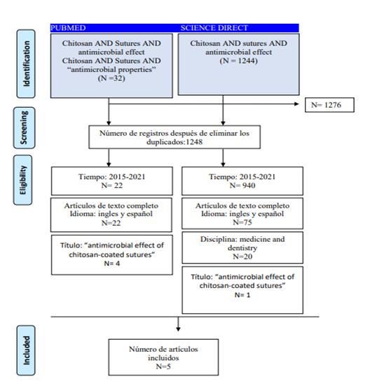 La búsqueda de artículos se realizó a partir del 20 de febrero al 18 de octubre de 2021 en las bases de datos PubMed y ScienceDirect utilizando las palabras clave “chitosan”, “sutures” y “antimicrobial effect”. En todas las bases de datos se conjuntaron las palabras clave con los operadores booleanos AND u OR.