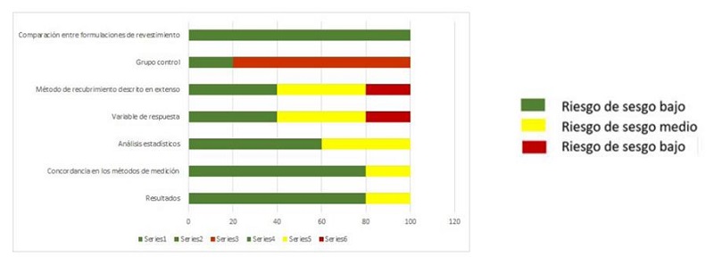 Se realizó el análisis de calidad de los artículos incluidos realizando un análisis crítico y jerarquizado, clasificando el nivel de evidencia disponible en la literatura en alta, moderada, baja y muy baja. Los parámetros utilizados fueron si presentaba comparación entre dos formulaciones, grupo control, método de cubrimiento descrito en extenso, análisis estadísticos, concordancia en los métodos de medición y finalmente los resultados de la variable de respuesta.