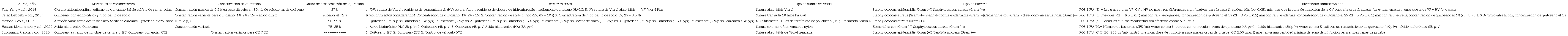 PM-KDG y OU-MA analizaron los artículos por título y resumen con base en los criterios de inclusión, así mismo, extrajeron los siguientes datos: tipo de sutura utilizada, grado de desacetilación del quitosano, concentración de quitosano, agentes o compuestos adicionales al quitosano, técnicas o métodos de incorporación del quitosano a las suturas, así como su efectividad antimicrobiana a través de la variable respuesta de concentración mínima inhibitoria (CMI) o zona de inhibición (ZI) y tasa de crecimiento de bacterias (TC).