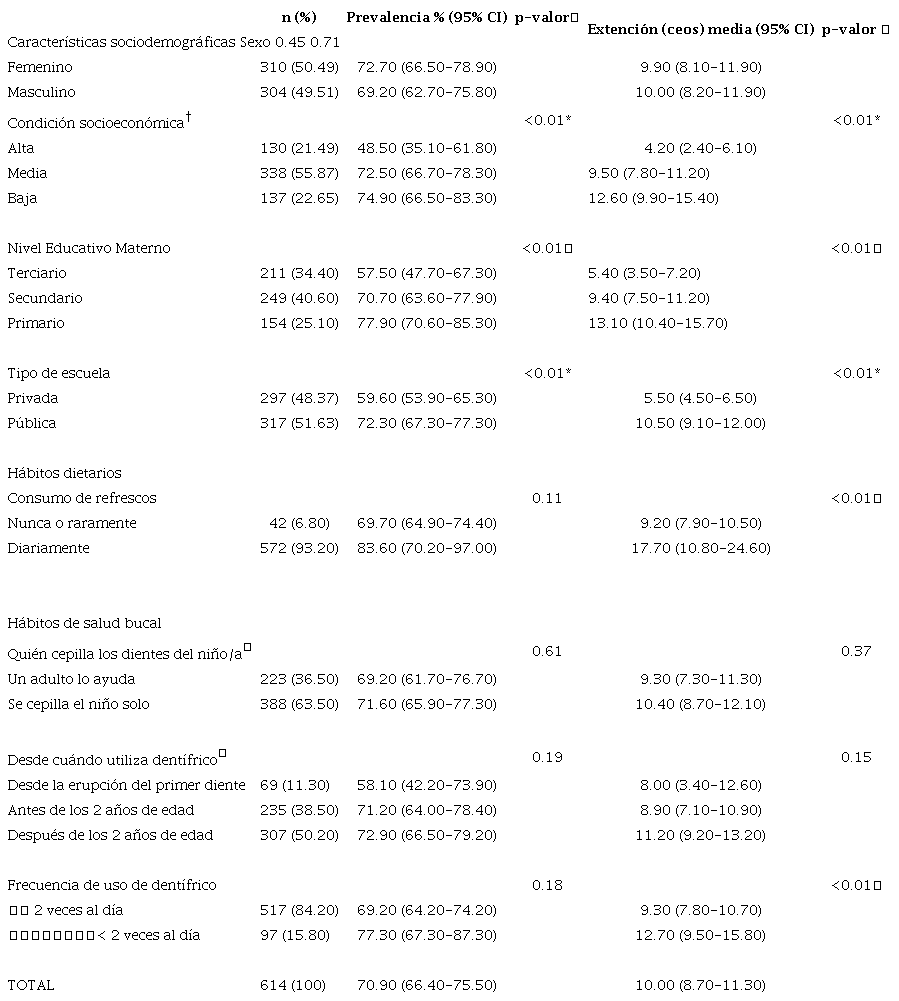Los niños que asistían a escuelas públicas, con NSE bajo, nivel educativo materno primario, que se cepillaban los dientes menos de dos veces al día y consumían refrescos diariamente, tenían un número significativamente mayor de superficies afectadas. Las lesiones de caries cavitadas no tratadas fueron las más prevalentes .40,9% (95% IC = 36,10-45,90).. Sólo el 14,4% (11,10-17,80) de los individuos tenían lesiones iniciales de caries.