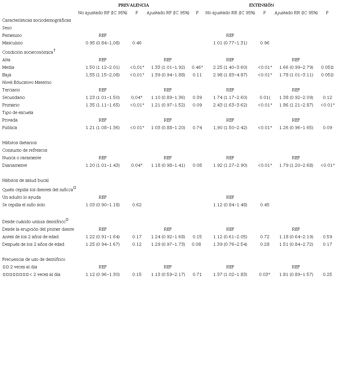 Al estudiar la asociación entre la prevalencia de caries y las variables explicativas (análisis de regresión de Poisson), SEC bajo y medio (RP=1,55; IC 95%=1,15-2,08 y RP=1,50; IC 95%=1,12-2,01 respectivamente), la NEM (RP primaria=1,35; IC 95%=1,11-1,65 y secundaria RP=1,23; IC 95%=1,01-1,50), los niños que asistieron a escuela pública (RP=1,21; IC 95%=1,08-1,36) y aquellos que consumían refrescos diariamente (RP=1,20; IC 95%=1,01-1,43) tuvieron resultados significativos solo en el modelo no ajustado (Tabla 2). Considerando la extensión, en el análisis ajustado (regresión de Poisson), se observó que los niños con SEC bajo y medio (RR=1,78; IC 95%=1,01-3,11 y RR=1,66; IC 95%=0,99-2,79 respectivamente), NEM primario (RR=1,86; IC 95%=1,21-2,87); bajo SEC (RR=1,78; IC 95%=1,01-3,11) y consumo diario de refrescos (RR=1,79; IC95%=1,20-2,68) fueron más propensos a tener lesiones de caries (Tabla 2).