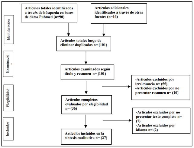 A partir de esta estrategia de búsqueda, se obtuvo un total de 90 artículos de potencial interés. Además, se agregaron a esta búsqueda 11 estudios que se identificaron en otras fuentes (Scielo,Google Scholar). El total de artículos recolectados por medio de la búsqueda total fue de 101. De estos artículos,10 fueron eliminados por no presentar resumen y 55 fueron eliminados por no tener relación al tema. Del total de estudios elegidos, se excluyeron artículos que no cumplieran con los criterios de inclusión, 7 no fue posible acceder al texto completo y 2 fueron descartados por el idioma. El total de estudios analizados para esta revisión fue de 27 artículos como se puede ver en la Fig. 1