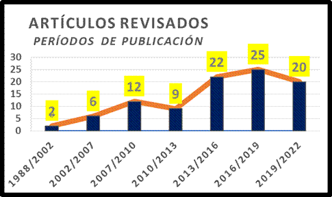 El total de las referencias seleccionadas inicialmente fue de 120. Se descartaron 24 y se analizaron 96, distribuidas según el año de publicación en: 2 (2.1%) con más de 20 años; 6 (6.25%) entre 15 y 20 años; 12 (12.5%) entre 12 y 15 años; 9 (9.4%) entre 9 y 12 años; 22 (22.9%) entre 6 y 9 años; 25 (26%) entre 6 y 3 años y 20 (20.8%) con menos de 3 años. En síntesis, 69.8% (67) de los trabajos revisados tenían menos de 9 años. En la Figura 2 se grafican estos resultados.