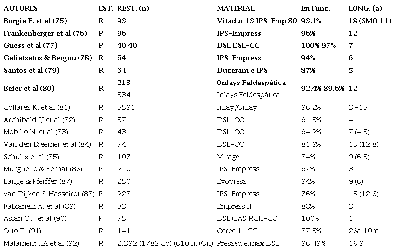 Murgueitio R, Bernal G.- Three-year clinical follow-up of posterior teeth restored with leucite-reinforced IPS Empress onlays and partial veneer crowns. J Prosthodont. 2012;21:340-5.