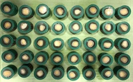 Una vez extraídas, las piezas dentarias se almacenaron en Cloramina T 0,5 % por siete días y posteriormente en agua destilada a una temperatura de 3° a 5º C hasta el momento del estudio, por no más de tres meses. Cada pieza dentaria se desgastó transversalmente, utilizando una recortadora con refrigeración, eliminando el esmalte de la cara oclusal, exponiendo una superficie de dentina coronaria, sin exposición pulpar. Las piezas desgastadas fueron incluidas en tubos de Polipropileno (PPL) utilizando resina acrílica, dejando expuesta la superficie de dentina. Luego de haber sido incluidas, las superficies expuestas de dentina fueron pulidas secuencialmente con lijas de carburo de silicio de granulometría 220, 400 y 600 a modo de estandarizarlas (Fig. 1).