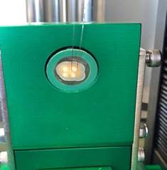 Todos los especímenes fueron almacenados en agua destilada a 37°C durante 24 horas, posteriormente dos de los cuatro cilindros de resina de cada uno de los especímenes, fueron sometidos al ensayo de microcizallamiento. Finalizado el ensayo inicial, los especímenes con los dos cilindros de resina restantes se almacenaron en agua destilada a 37°C durante seis meses. Finalizado el período de envejecimiento, a los dos cilindros restantes en cada espécimen se les realizó el ensayo de microcizallamiento. El ensayo de resistencia de unión al cizallamiento se ejecutó siguiendo la normativa ISO 29022 18 utilizando una máquina universal de ensayos mecánicos (CMT 2000, MTS SANS, China). Un bucle de alambre de acero inoxidable de 0,5 mm de diámetro fue adaptado con precisión a la interfaz adhesiva resina-dentina a una velocidad de cruceta de 1.0 mm/min. (Fig. 2). La resistencia de unión (en MPa) se calculó dividiendo la carga (en Newtons), con el área de interfaz de la unión (mm2).