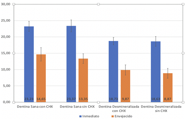 Resultados: El grupo de dentina sana, sin CHX inmediato presentó mayor resistencia adhesiva (23,37±1,84). El grupo de dentina desmineralizada, sin CHX, envejecido presentó la menor resistencia adhesiva (8,87±1,51).