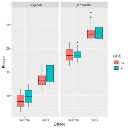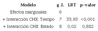 Para explicar las variaciones de los valores de resistencia adhesiva de los diferentes especímenes se planteó un modelo de efectos marginales donde se consideraron los tres factores pretratamiento (con y sin CHX), tiempo (inmediato y seis meses), estado dentinario (DS y DD) (Tabla 1). Existe una interacción significativa del pretratamiento con CHX por tiempo (inmediato y seis meses) en los valores de resistencia adhesiva con la prueba de razón de verosimilitud LRT=33,93, p≤0,001. Sin embargo, no existe interacción significativa del pretatamiento con CHX con respecto al estado de la dentina (DS y DD) en la resistencia adhesiva con LRT =0,02, p=0,88.