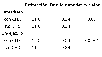 Se observó un efecto significativo del pretratamiento con CHX en relación con el tiempo (p<0,001), no así con respecto al estado de desmineralización (p=0,882). Las comparaciones múltiples (Tabla 2) indicaron que la resistencia de unión en el ensayo inmediato entre los cilindros pretratados con CHX no difirieron significativamente de los no tratados con p=0,89. Sin embargo, a los seis meses se observó una diferencia estadísticamente significativa 1,2 MPa entre el grupo tratado con CHX y el grupo sin CHX con p≤0,001 ambas comparaciones fueron ajustadas por el estado de desmineralización.
