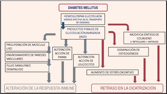 La DM afecta varias funciones del sistema inmune, alterando la respuesta celular y retrasando la cicatrización. (FIGURA 1) Esta situación predispone a la inflamación crónica y a la progresiva destrucción tisular (23)