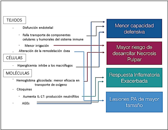 El estado de hiperglucemia que genera la DM afecta la circulación y produce diversos cambios en la pulpa y los tejidos PA. (FIGURA 2) La DM perjudica la función bactericida de los neutrófilos, afectando seriamente la respuesta inmune. (24)