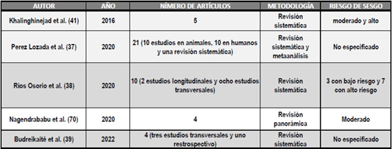 En la Tabla 1 se especifican los aspectos metodológicos de revisiones sistemáticas y metaanálisis.