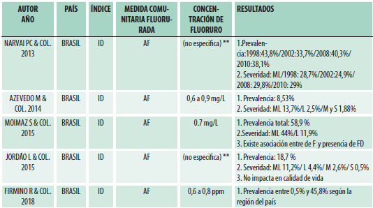 Conclusiones: existe gran variabilidad en los reportes de prevalencia de fluorosis dental. Independientemente del método de fluoruración comunitario utilizado las lesiones de fluorosis de severidad leve son las más prevalentes.