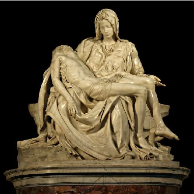 La mayoría de la iconografía católica muestra, como en La piedad, de Miguel Angel, una expresión muy moderada y recatada de las expresiones corporales del sufrimiento. La Virgen María, joven y bella, sostiene en las rodillas a su hijo muerto luego del descendimiento de la cruz. Pese a ello, se muestra tierna y piadosa, aceptando el castigo con humildad y resignación. Casi no es posible inferir su angustia si no fuera por el contexto, por la figura de Cristo exánime. El dolor y el sufrimiento son trascendidos por la fortaleza espiritual.