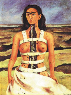 Esa vida golpeada la llevó a autorretratarse como en La columna rota(1944): Frida está sola, llorando en una llanura bajo un cielo amenazante, su cuerpo perforado por clavos, visibles en su torso desnudo las correas de un corsé que usó durante meses y la espina dorsal representada por una columna de material destrozada en varias partes.