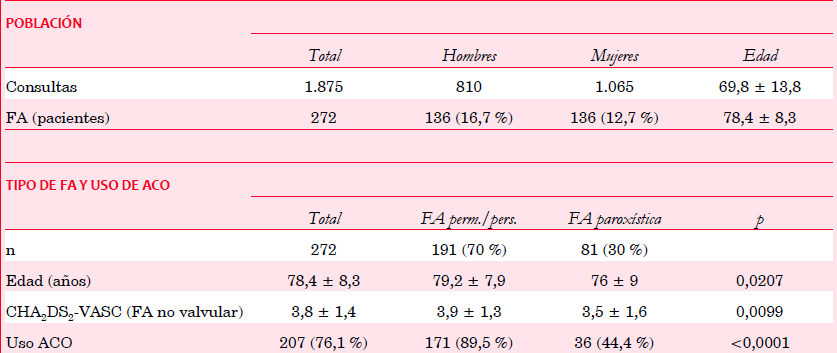 Resultados: entre 1.875 consultas analizadas, tenían registros de FA 282 (15%), correspondientes a 272 pacientes. La edad de los que tenían FA fue 78,4 ± 8,3 años, mientras que fue 68,3 ± 14 años en el resto (p<0,001). En el sexo masculi- no tenían FA 136 de 810 (16,7%) y en el sexo femenino en 136 de 1.065 (12,7%) (p=0,0171). El 70% tenía FA permanen- te/persistente y 30% la forma paroxística. En FA permanente/persistente la edad media fue 79,2 ± 7,9 años y en FA paro- xística fue 76,5 ± 9 años (p=0,0207), el score CHA.DS.VASc promedio fue 3,9 ± 1,3 y 3,5 ± 1,6 (p=0,0099) respectiva- mente. Recibían algún tratamiento antitrombótico 252 (92,6%), un anticoagulante oral (ACO) 207 (76,1%), antiagre- gantes plaquetarios 55 (20,2%) y ambos 10 (3,7%). En FA permanente/persistente recibían ACO 171 de 191 pacientes (89,5 %) y en FA pa ro xís ti ca 36 de 81 (44,4%) (p< 0,0001). El ACO uti li za do fue war fa ri na en 64 (23,5%) y un an ti coa gulante di rec to (NOAC) en 143 (52,6%).